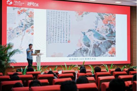 活动现场,赵兴老师讲述了岭南画派鼻祖居巢、居廉以及第一代创始人高剑父、高奇峰、陈树人的艺术成就,引领大家赏析他们的代表作,结合岭南画派的源起、发展和变革,进行了精彩生动的讲述。